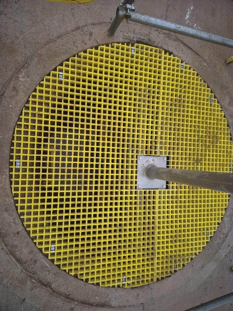 To ensure long-term durability and resistance to chemical corrosion, Glass Reinforced Plastic (GRP) beams and flooring were installed within the chamber. GRP provides excellent chemical resistance, structural strength, and low maintenance requirements, making it ideal for harsh industrial environments.